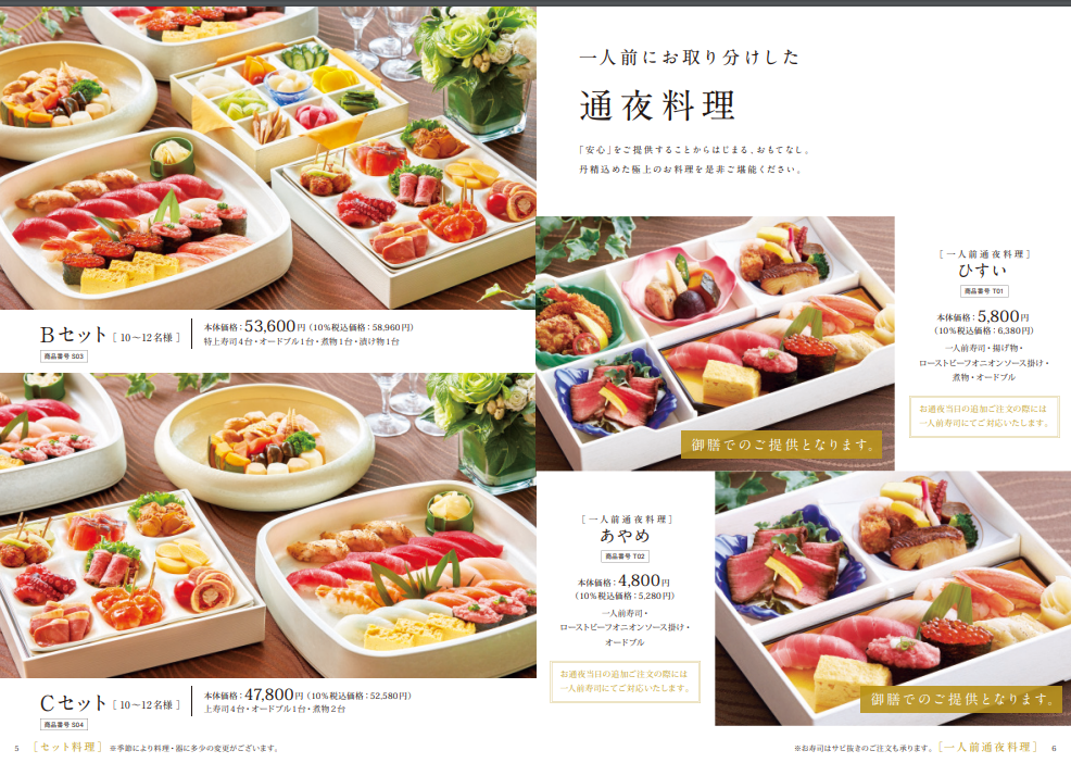 お通夜後の食事になります。お清めと言われている食事の席になります。落合斎場の控室での食事となります。ご予算に応じてお選びいただけます。配膳スタッフが食事をセットいたします。