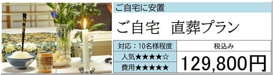 | 福井葬儀社 ご自宅安置 火葬式 直葬プラン | 129,800円(税込み) □お棺 □ドライアイス1回 □白木位牌 □火葬場案内□死亡届代行 □旅支度 □寝台自動車2回 |