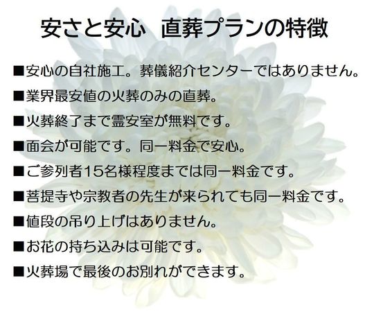 | 福井葬儀社 霊安室無料 火葬式 直葬プラン | 95,700円(税込み) □お棺 □ドライアイス1回 □白木位牌 □火葬場案内□死亡届代行 □旅支度 □寝台自動車1回 |