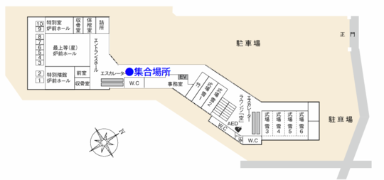 ご火葬指定のお時間の30分前に落合斎場にご集合ください。集合場所は代々幡斎場1階ホールにソファーがありますのでそちらでお待ちください。