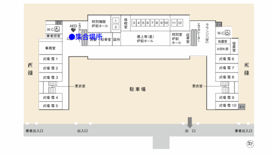 ご火葬指定のお時間の30分前に町屋斎場にご集合ください。集合場所は町屋斎場1階正面ホールにソファーがありますのでそちらでお待ちください。待合場所は他の火葬場と比べて広いです。15名様程度までの待ち合わせには問題ありません。