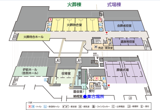ご火葬指定のお時間の30分前に臨海斎場にご集合ください。集合場所は臨海斎場1階受付前正面ホールにソファーがありますのでそちらでお待ちください。