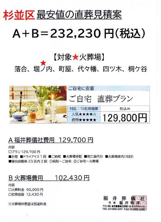 都内最安値の火葬見積です。この価格帯で直葬ができるのは都内で3社程度。ご参考にしてください。