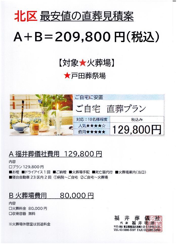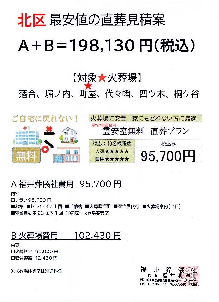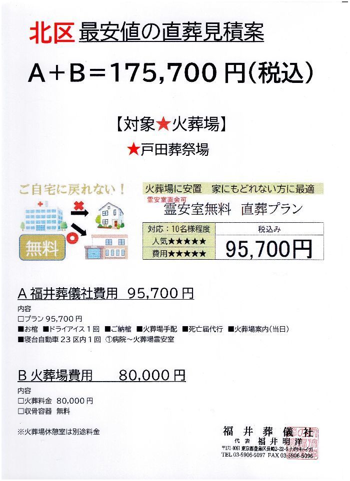 北区の皆様はを利用し板橋区の戸田葬祭場もしくは、荒川区の町屋斎場てご火葬を行います。火葬料金を含めた最安値の見積をご参考にしてください。