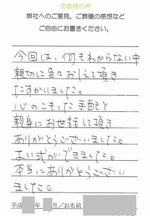 お便りが遅くなりまして申し訳ありません。先日はお世話になりまして有難うございました。電話の時から誠意ある対応をして頂きましたので、最初の不安がなくなり当日を迎えることが出来ました。私の要望にも快く引き受けて下さり細部にわたり、真心のご配慮をして頂けました事に感謝の持ちで一杯です。お蔭様で母と充分なお別れができましたし参列の方にも良い印象を持ってもらえました。何かの折には貴社様のお話をさせて頂こうと思います。
